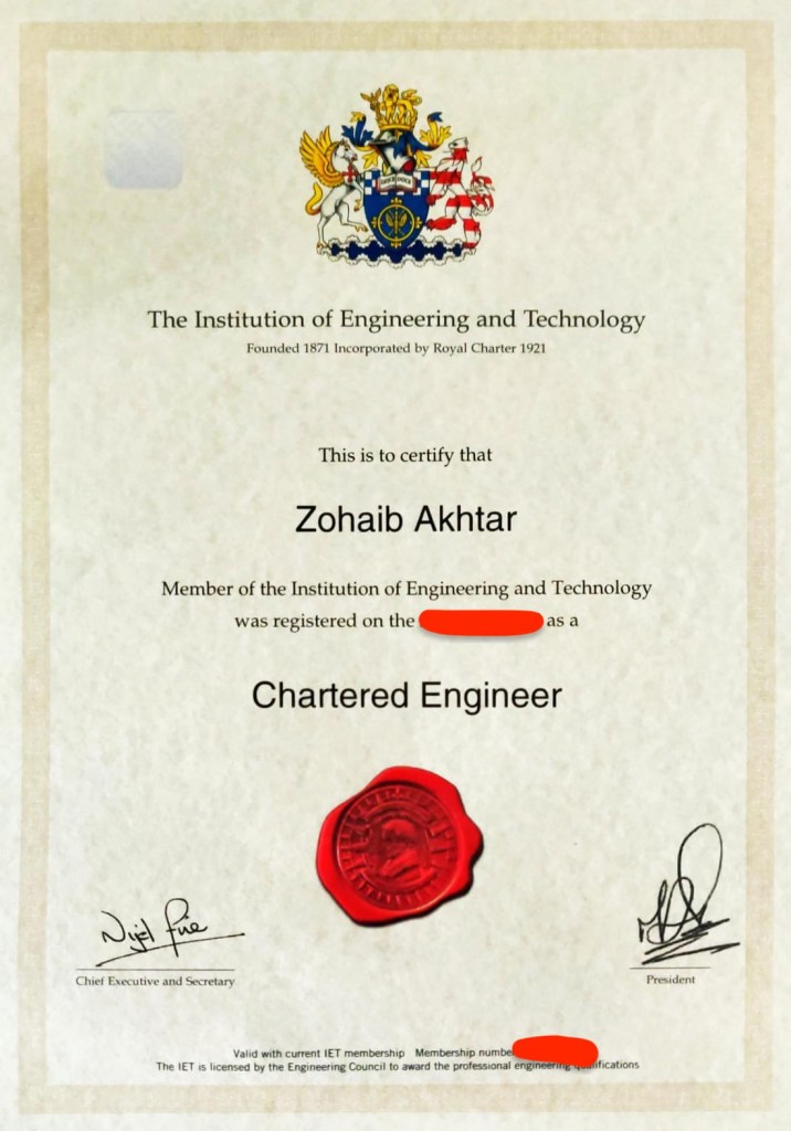 I received my Chartered Engineer (CEng) certificate today, a recognition of my engineering expertise.
