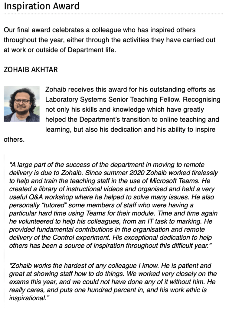 The Inspiration Award celebrates colleagues who inspire others through their work or contributions beyond the department. I was honored to receive this award for my role in transitioning the Department to online teaching and learning during the pandemic. The award highlights my dedication, ability to inspire, and the skills that contributed to this significant change. Read more:https://www.imperial.ac.uk/news/226253/the-eee-community-celebrates-thanks-colleagues/
