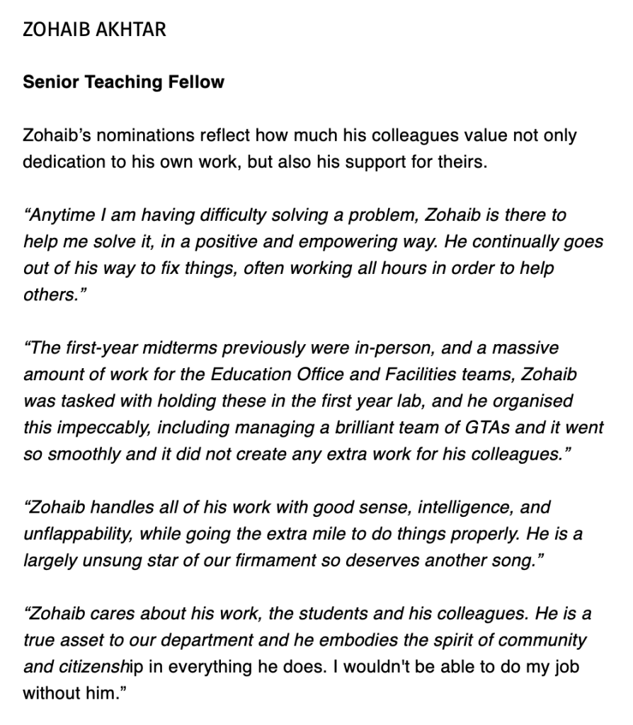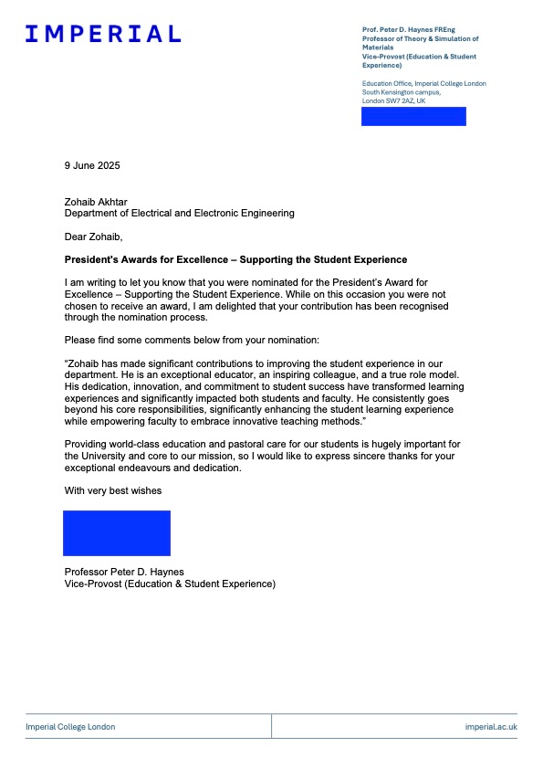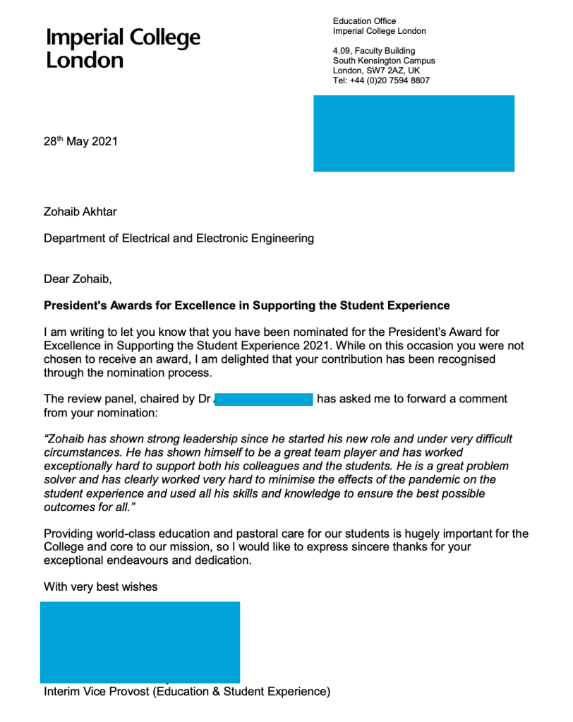 As a member of the second-year project design team, I was honored with this award. Our team developed a remote second-year project in response to the challenges posed by remote learning. The project, built entirely remotely, challenged students to collaborate on designing a modular rover system. Read more: https://www.imperial.ac.uk/news/226253/the-eee-community-celebrates-thanks-colleagues/