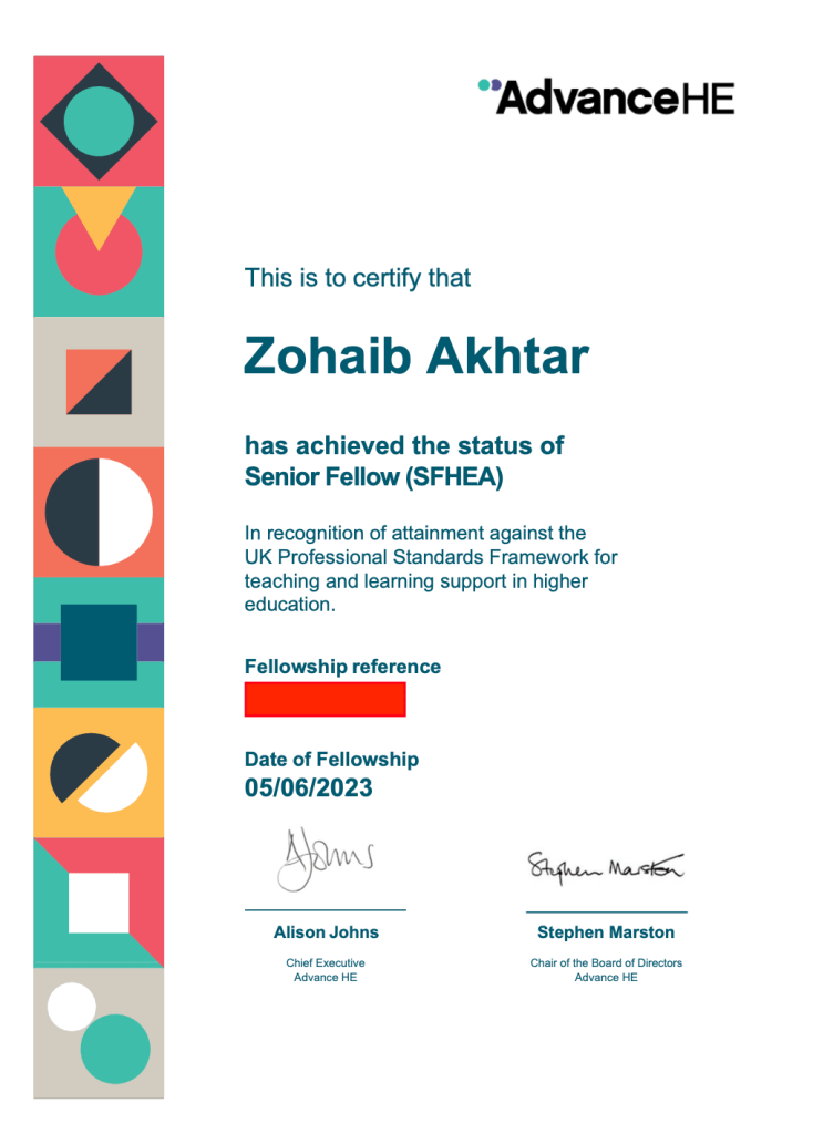 I received my SFHEA certificate today, marking a significant milestone in my professional journey.