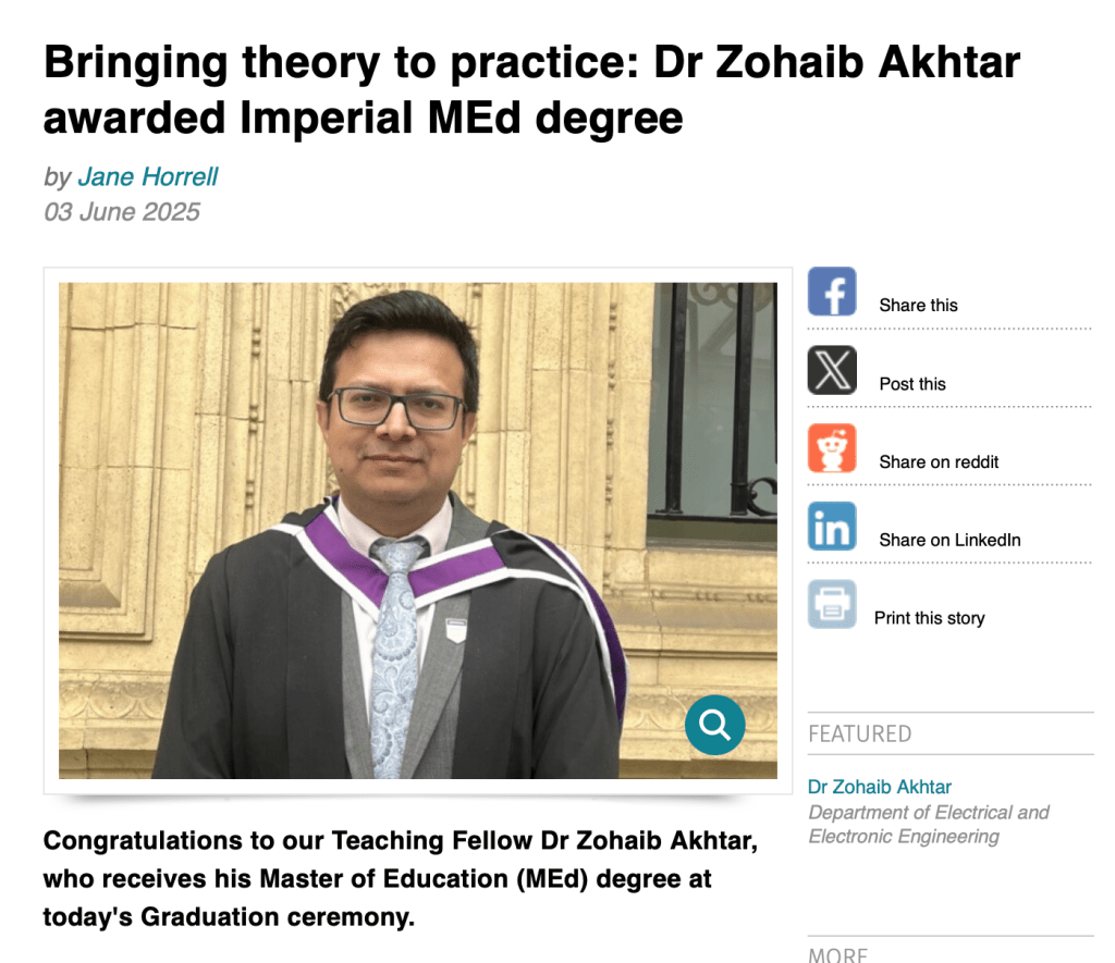 Bringing theory to practice: Dr Zohaib Akhtar awarded Imperial MEd degree – 3 June 2025